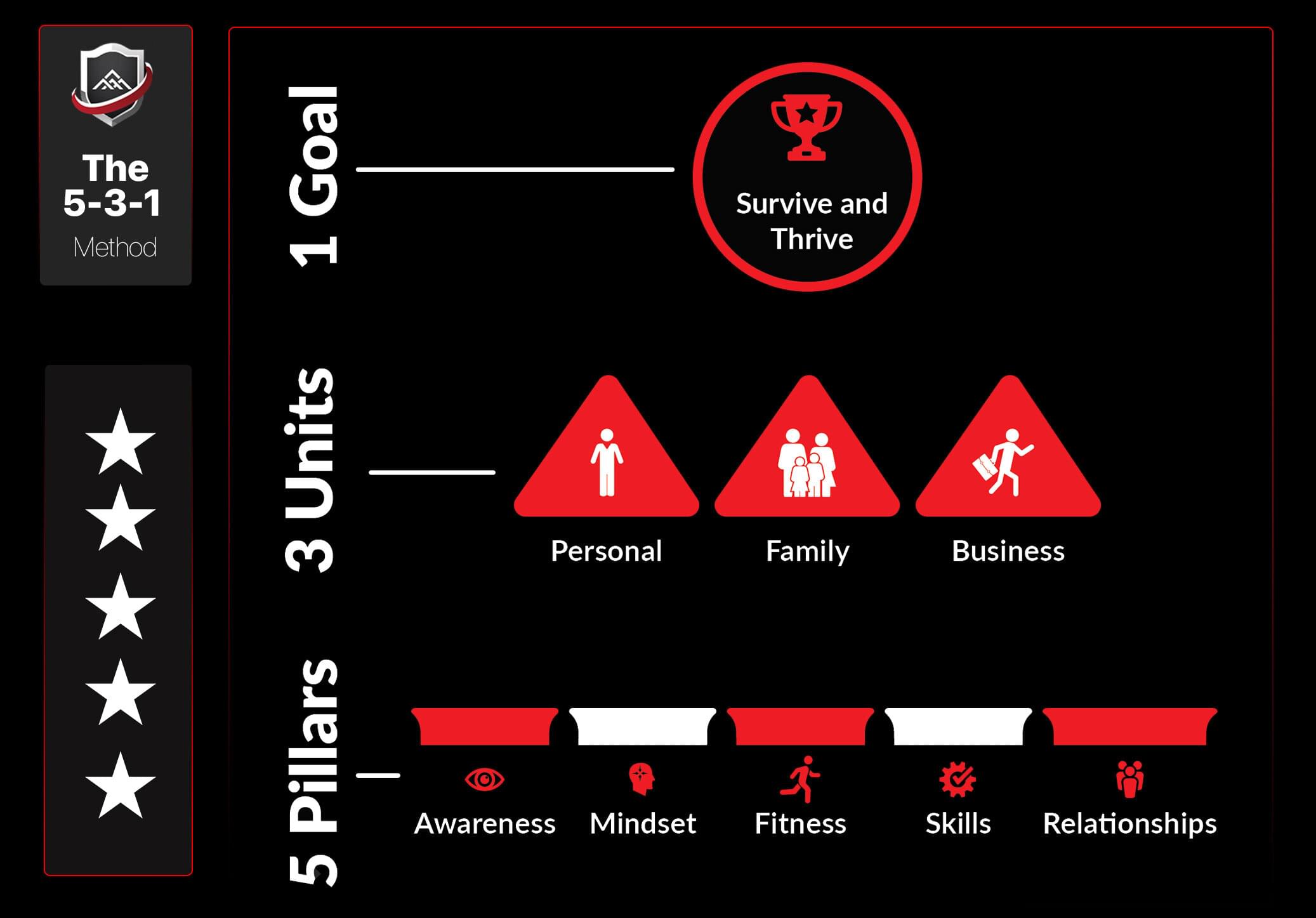 This exclusive training applies the REAL™ Methodology, a system that focuses on five pillars of resiliency – REAL™ Awareness, REAL™ Mindset, REAL™ Fitness, REAL™ Skills, and REAL™ Relationships – applied to three units – Personal Resiliency, Family Readiness, and Business Preparedness – to achieve one goal – to Survive and Thrive.